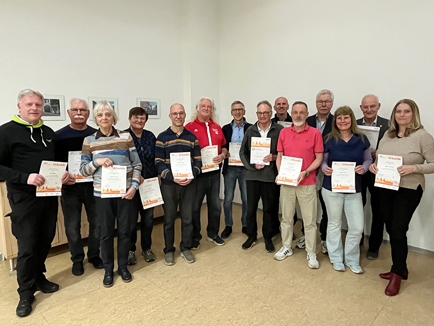 Ohne sie würde es im Wetteraukreis kein Sportabzeichen geben: Die Rede ist von den ehrenamtlich tätigen Sportabzeichenprüfer/innen im Sportkreis Wetterau. Die hatten jetzt Grund zur Freude: Der Sportkreis hatte zur feierlichen Ehrung langjähriger Prüferinnen und Prüfer nach Dortelweil eingeladen. Insgesamt 17 engagierte Ehrenamtliche galt es auszuzeichnen; 14 davon waren anwesend.