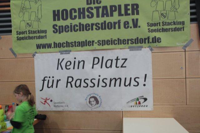 Auch Sportstacker machen Werbung für "Kein Platz für Rassismus" - hier beim Wettkampf in Speichersdorf